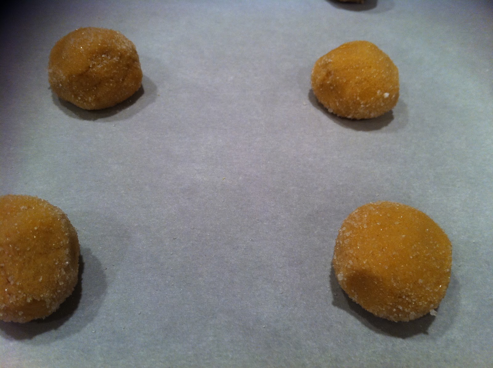 - Roll dough balls in sugar, and place on parchment-lined cookie sheet