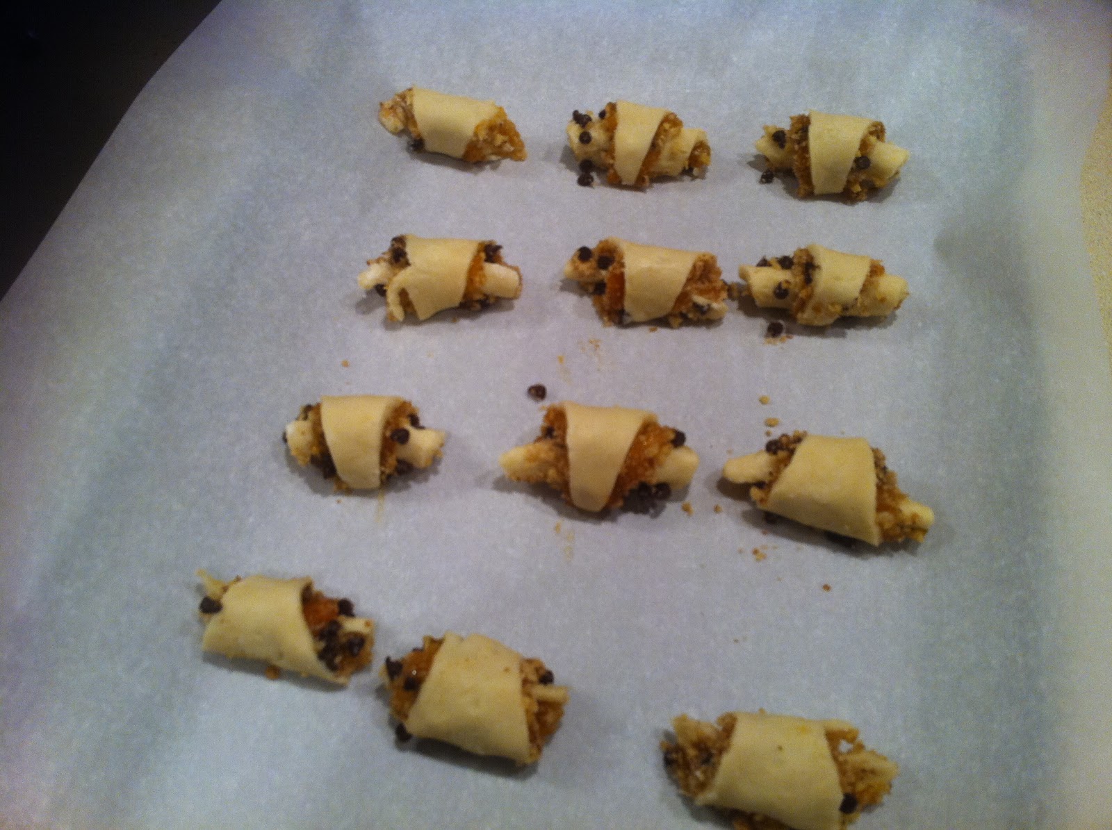 Rugelach is Yiddish for "little corners" (although sometimes it is attributed as being related to the word "royal"), with the -ach ending actually denoting the plural form of the word. It originated with the Ashkenazic Jews of central and eastern Europe, who adapted the tradition of using sour cream in dough from the Middle East. The dough is typically sour cream or cream cheese-based, and it is rolled around a filling that typically contains nuts, spices and/or raisins. Sour cream-based rugelach is typically a yeast dough, while cream cheese rugelach typically uses eggs as the leavening agent. This recipe falls into the latter category.